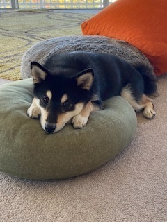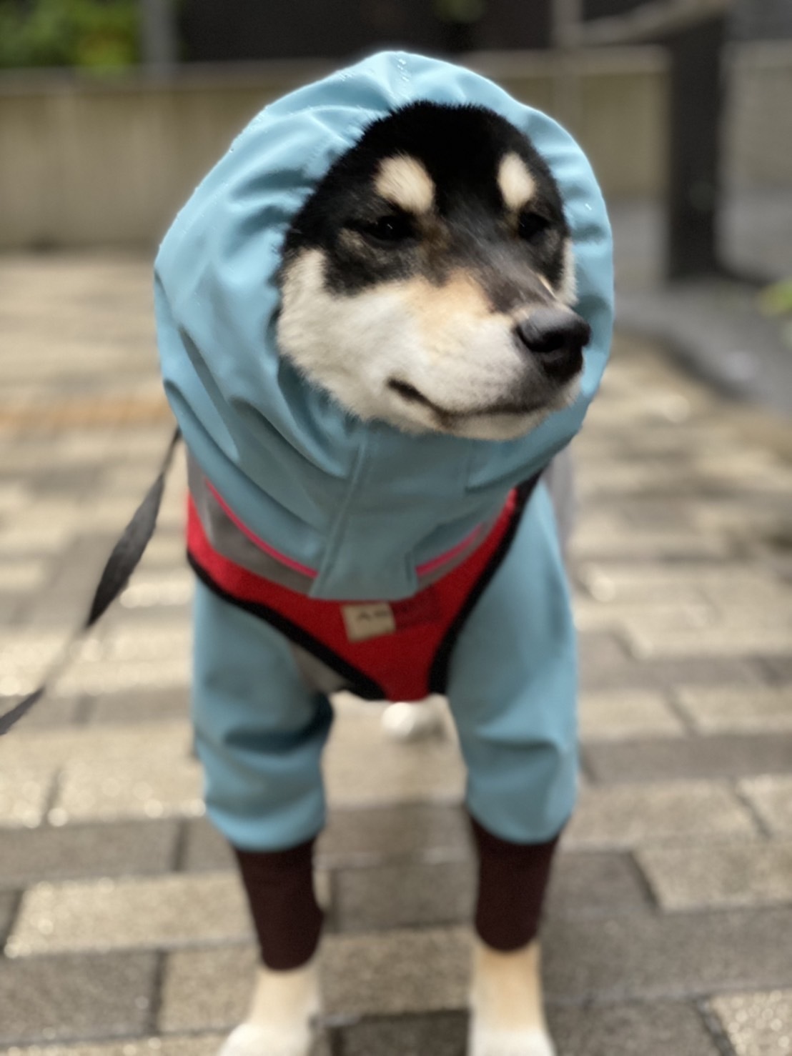 初レインコート。被ってても柴犬って分かるな
