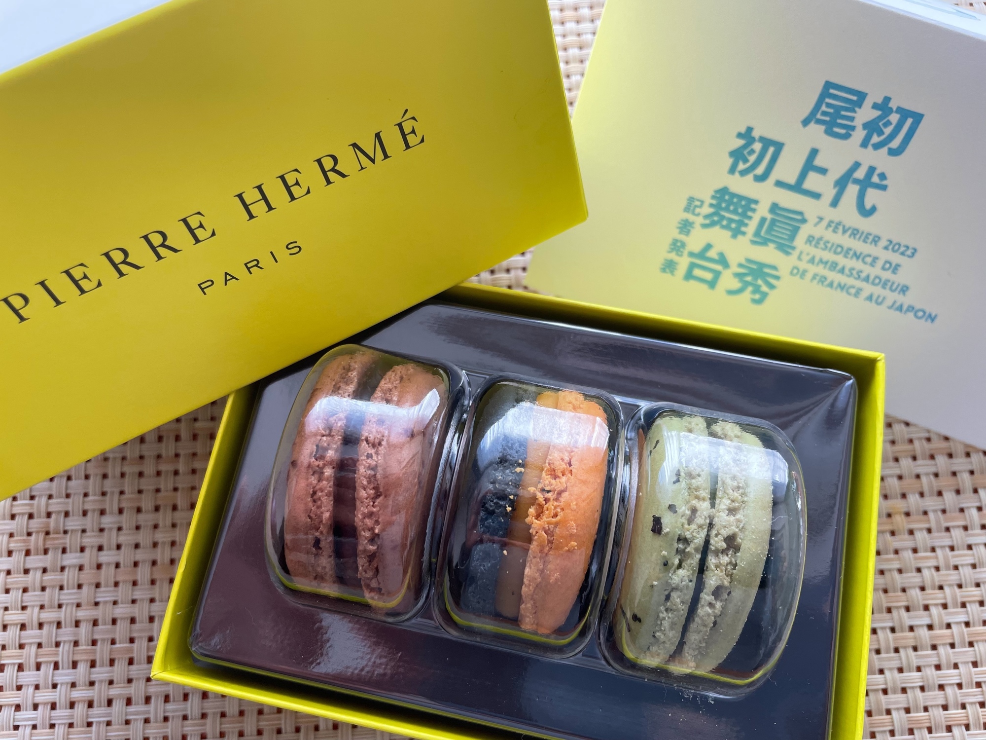 記者会見でマスコミの皆様にお配りしたピエールエルメのマカロン。