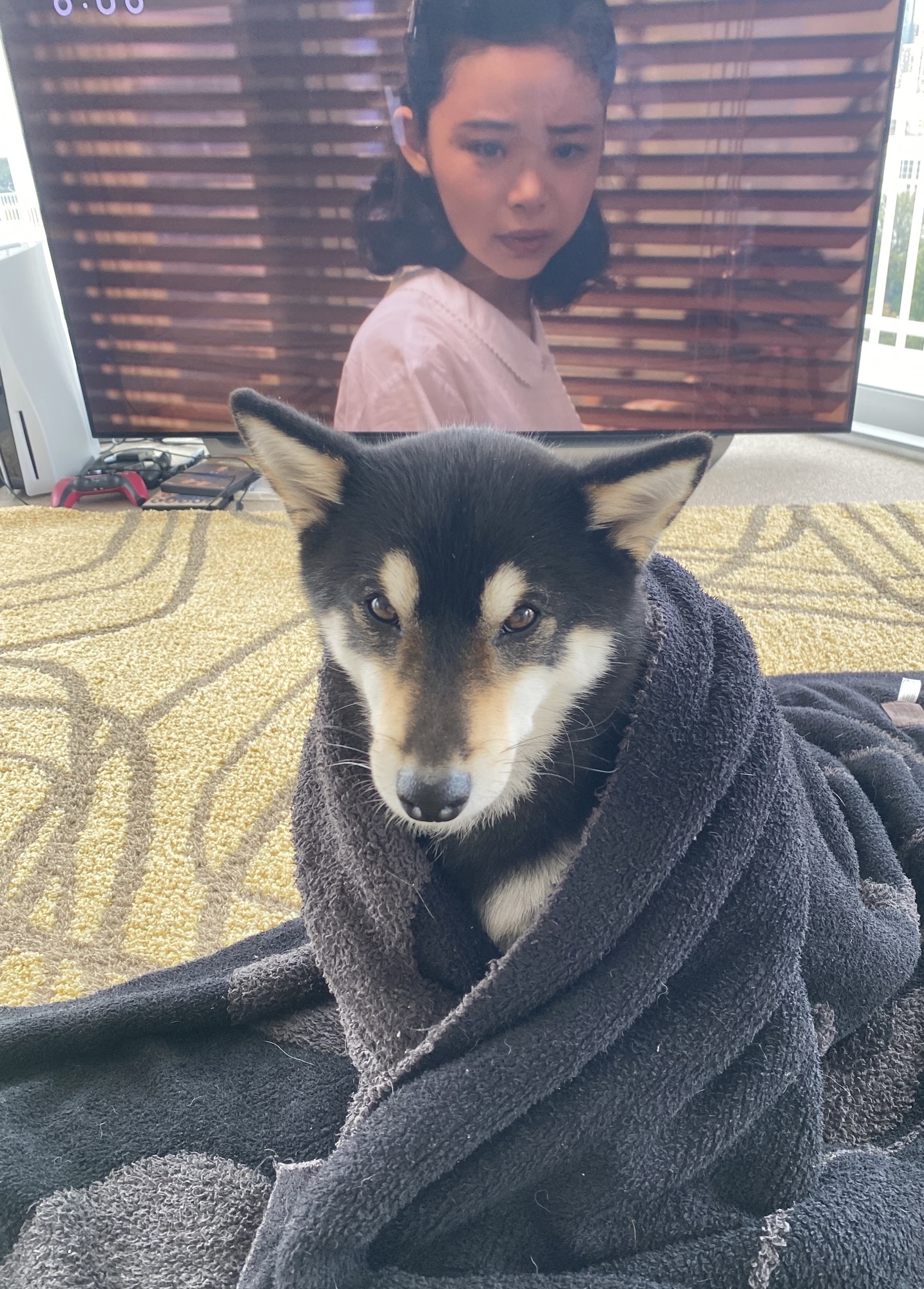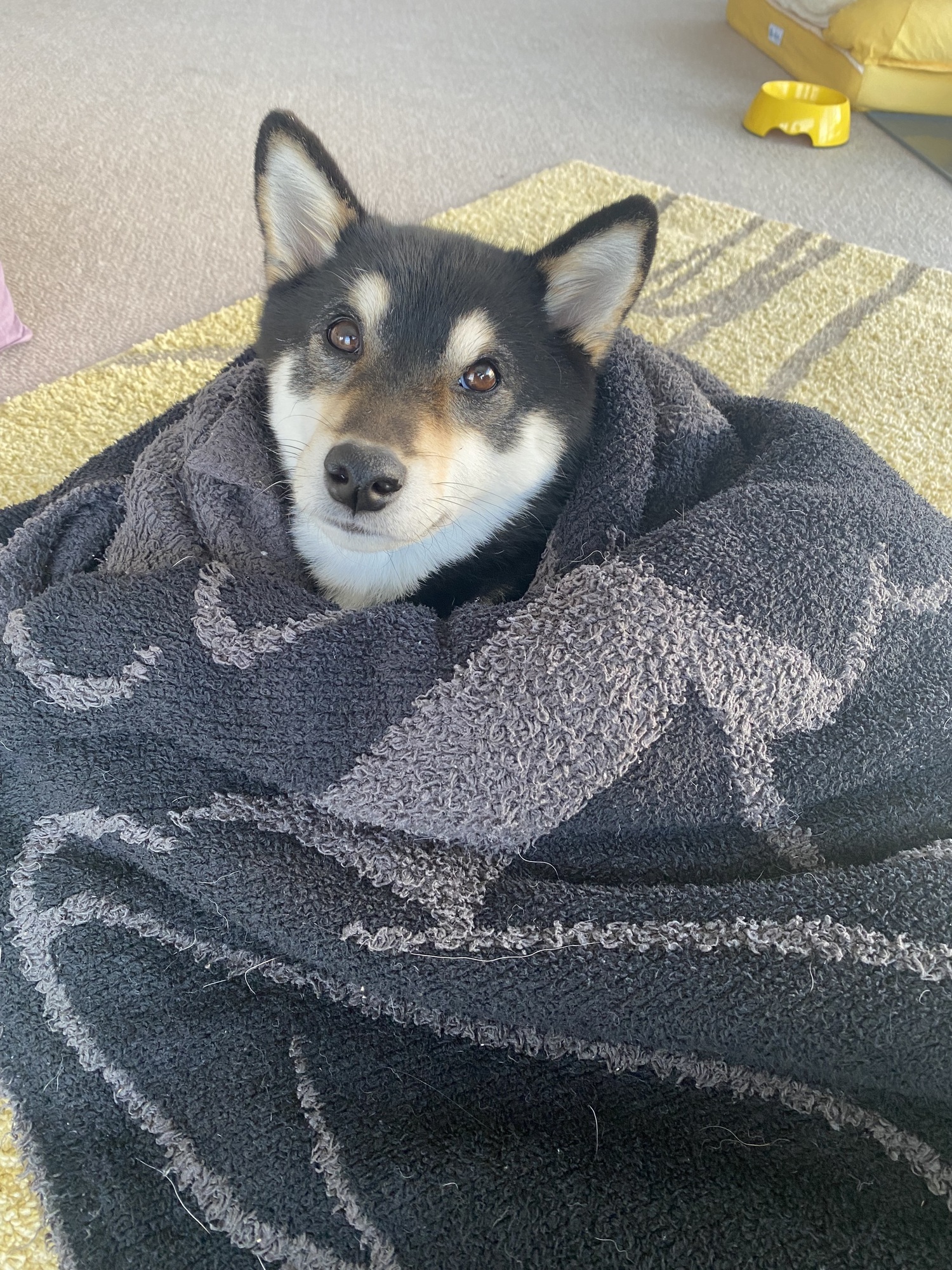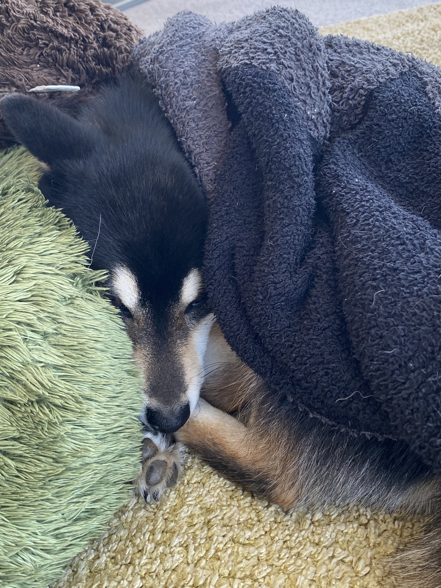 柴犬なんだけど、なんか、寒がり。眞秀の匂いが染みついた毛布にずっとくるまってます。