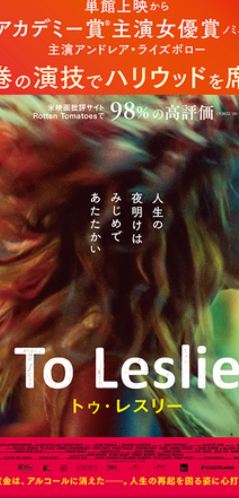 まあ、天音さん主演男優賞に値する素晴らしい存在感。この人がスクリーンに出てくると他の人が全て嘘モノに見えてしまったくらい恐ろしいリアル感で存在していた。"トゥ・レスリー"のライズボローといい圧倒的な主演の存在で見せる映画にぶち当たり嫉妬を覚えている。